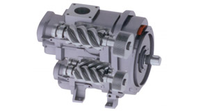采用两级压缩主机,也即将一级压缩转子和二级压缩转子组合在一个机壳里面,并分别通过斜齿轮直接传动。自然空气通过空气过滤器进入第一级压缩,在压缩腔与少量润滑油混合,同时将混合气体压缩到级间压力。压缩后的气体进入冷却通道,与大量油雾接触,从而大大降低了温度。降温后的压缩气体进入第二级转子,进行二次压缩,被压缩到最终排气压力。