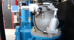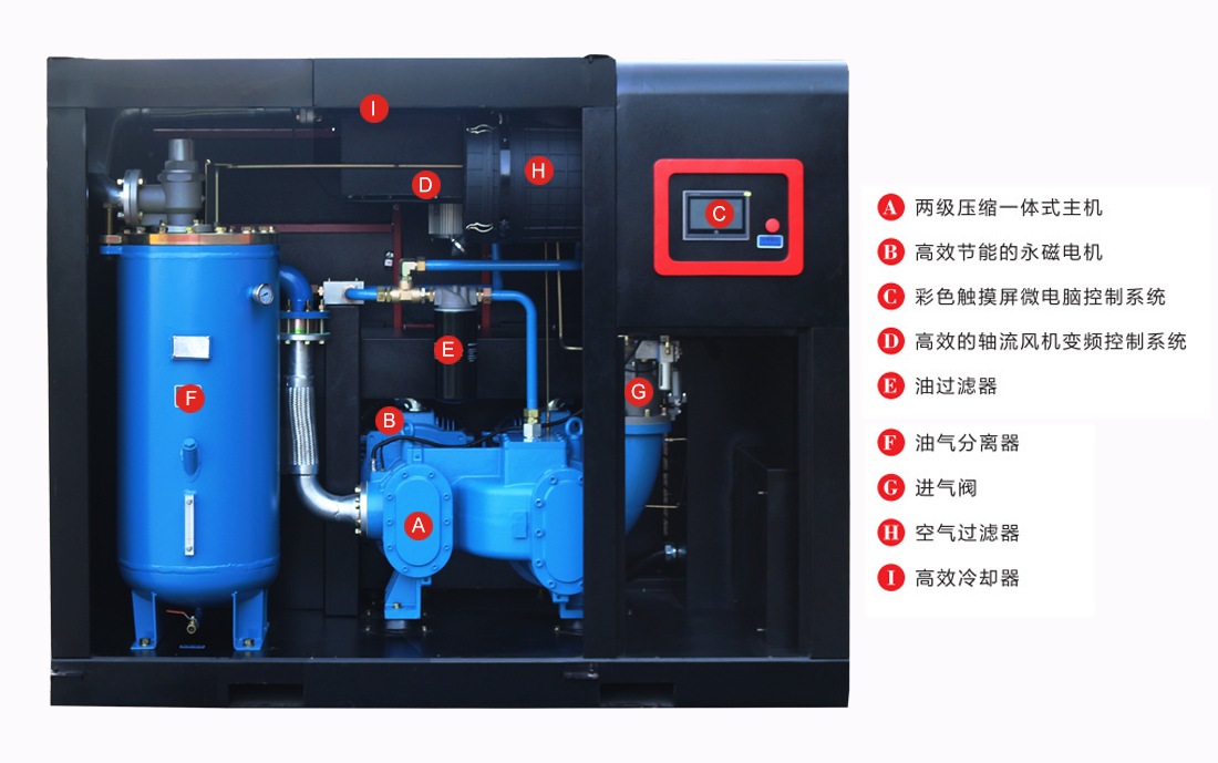 采用无级调速两级压缩主机,也是将一级压缩转子和二级压缩转子组合在一个机壳里面水平对置,并通过两个高效永磁电机分别同轴驱动。自然空气通过空气过滤器、进气阀进入第一级压缩,在压缩腔与少量润滑油混合,同时将混合气体压缩到级间压力。压缩后的气体进入冷却通道,与大量油雾接触,从而大大降低了温度。降温后的压缩气体进入第二级转子,进行二次压缩,被压缩到最终排气压力。